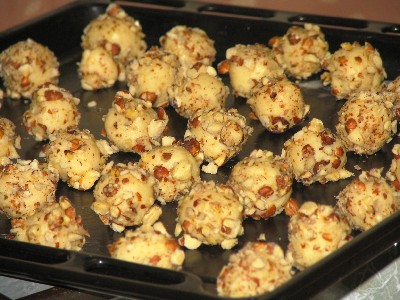 - hamurları ceviz büyüklüğünde yuvarlayın. yuvarladığınız hamurların her tarafını önce yumurta akına sonra fındığa bulayın.