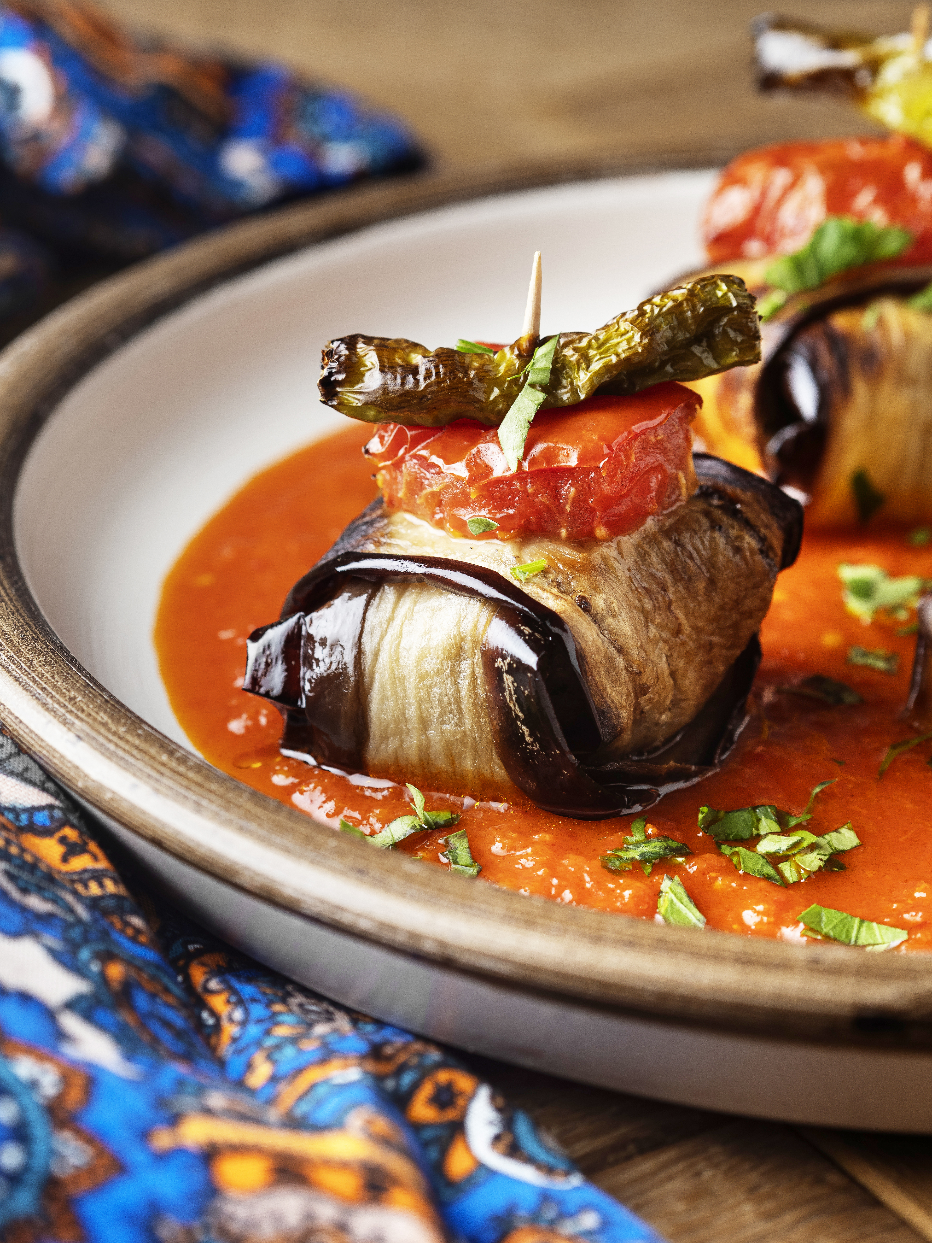Patlıcanları alacalı soyup uzunlamasına dilimleyin. Dilimleri tuzlayın veya tuzlu suda bekletin. Bu arada köfteyi hazırlayın. Köfte harcındaki tüm malzemeleri karıştırıp yoğurun. Harçtan yumurtadan biraz küçük parçalar koparıp yuvarlayın. Cam tepside fırına sürüp 200C’de pişirin. Köfteler pişerken patlıcanları kızgın yağda hafif pembeleşene kadar kızartın. Bir tabağa 2 patlıcan dilimini artı olacak şekilde yerleştirin. İçine bir köfte koyup patlıcanları üzerine kapatın. Böylece her birini tamamlayıp fırın tepsisine yerleştirin. Üzerine 1 biber dilimi ve 1 domates dilimi yerleştirip kürdan batırın ve 200C’de pişirin. Sosu için domatesleri soyup rendeleyin. Biraz sıvıyağ ile tavada öldürün, suyu ilave edip kaynatın. Tuzunu da ekledikten sonra tabaklara paylaştırın. Afiyet olsun!
