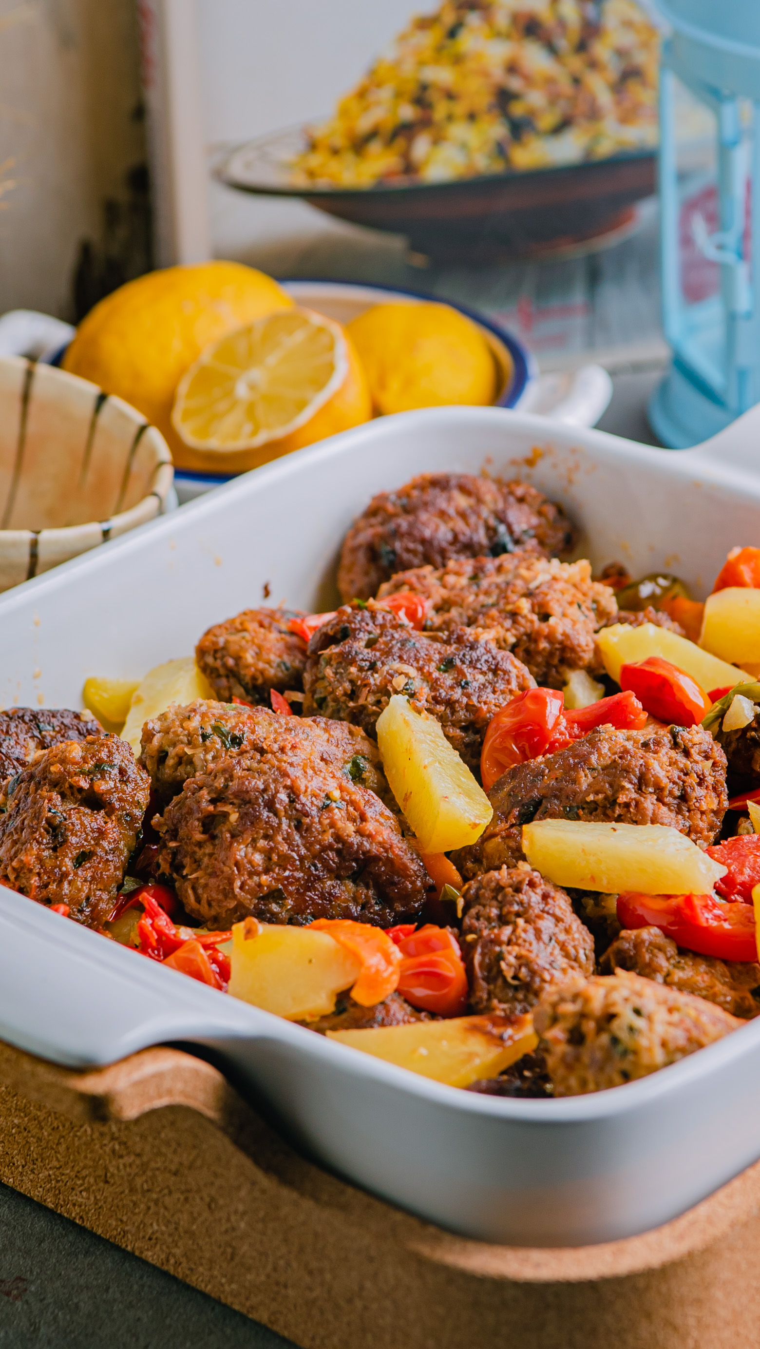 Tüm köfte malzemelerini yoğurun. Köftelere şekil verip geniş bir tavada yağda kızartın. Kızarttığınız köfteleri alın. Aynı tavada havuç, biber ve patatesleri hafifçe kızartın. Bunları bir kaba alıp yağlarının hafif süzülmesini sağlayın. Çeri domatesleri aynı tavada hafifçe öldürün. Önce patates, biberleri, sonra da köfteleri aynı tavaya alın. Gerekirse çay bardağının yarısı kadar su ekleyin.Sebzeler tamamen pişince tuzunu ekleyip servis yapın.