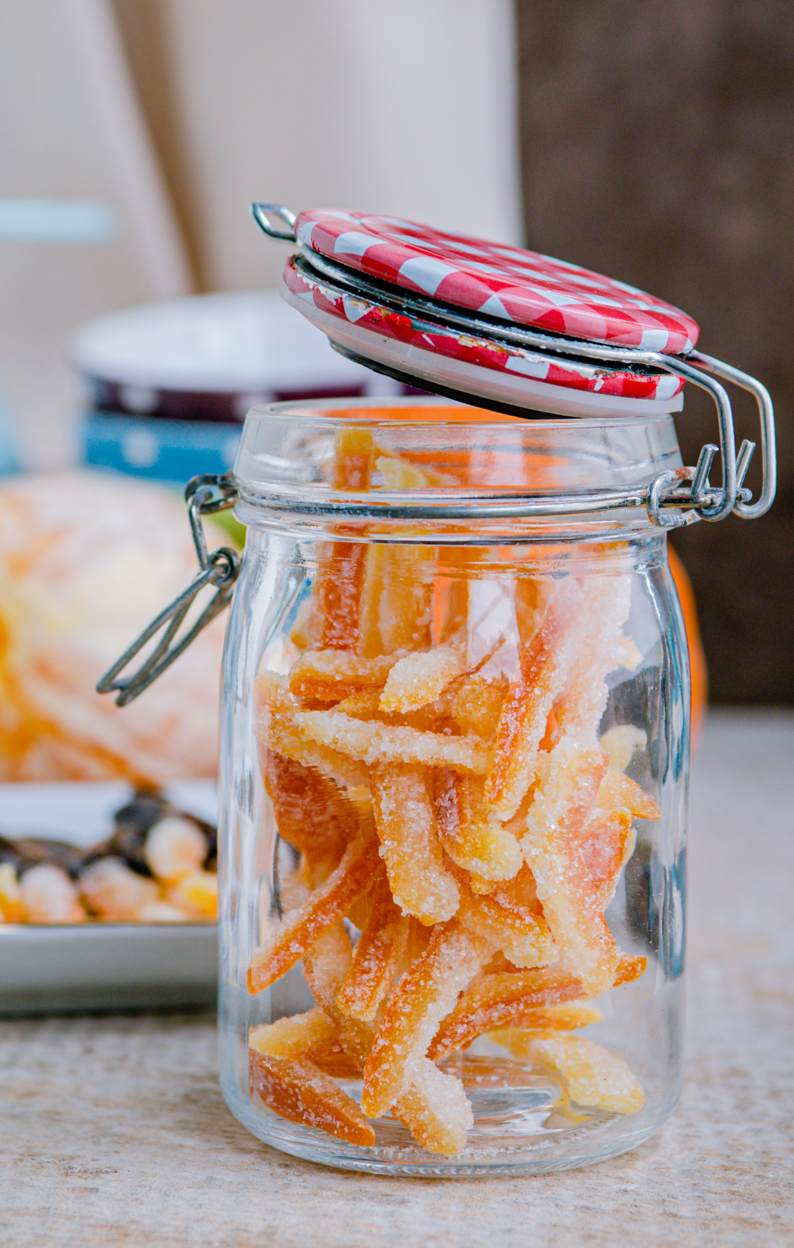 Portakallarınızı yıkayıp kabuklarını soyun. İnce ince kesip 10 dakika kaynatın. Ayrı bir kapta birer bardak su ve şekeri şerbet için kaynatın. Portakal kabuklarını kaynar sudan çıkartın. Sudan geçirin ve şerbete atın, 45 dakika pişirin. Piştikten sonra süzgece alın ve tamamen süzülmesi için yarım saat bekletin. Yarım saatin sonunda kalan bir bardak şekeri bir kaba boşaltın. Portakalları tek tek şekere batırıp fırın teline dizin. 24-48 saat bekletin. (Fırında bekletecekseniz fırın kapağı açık olsun)
