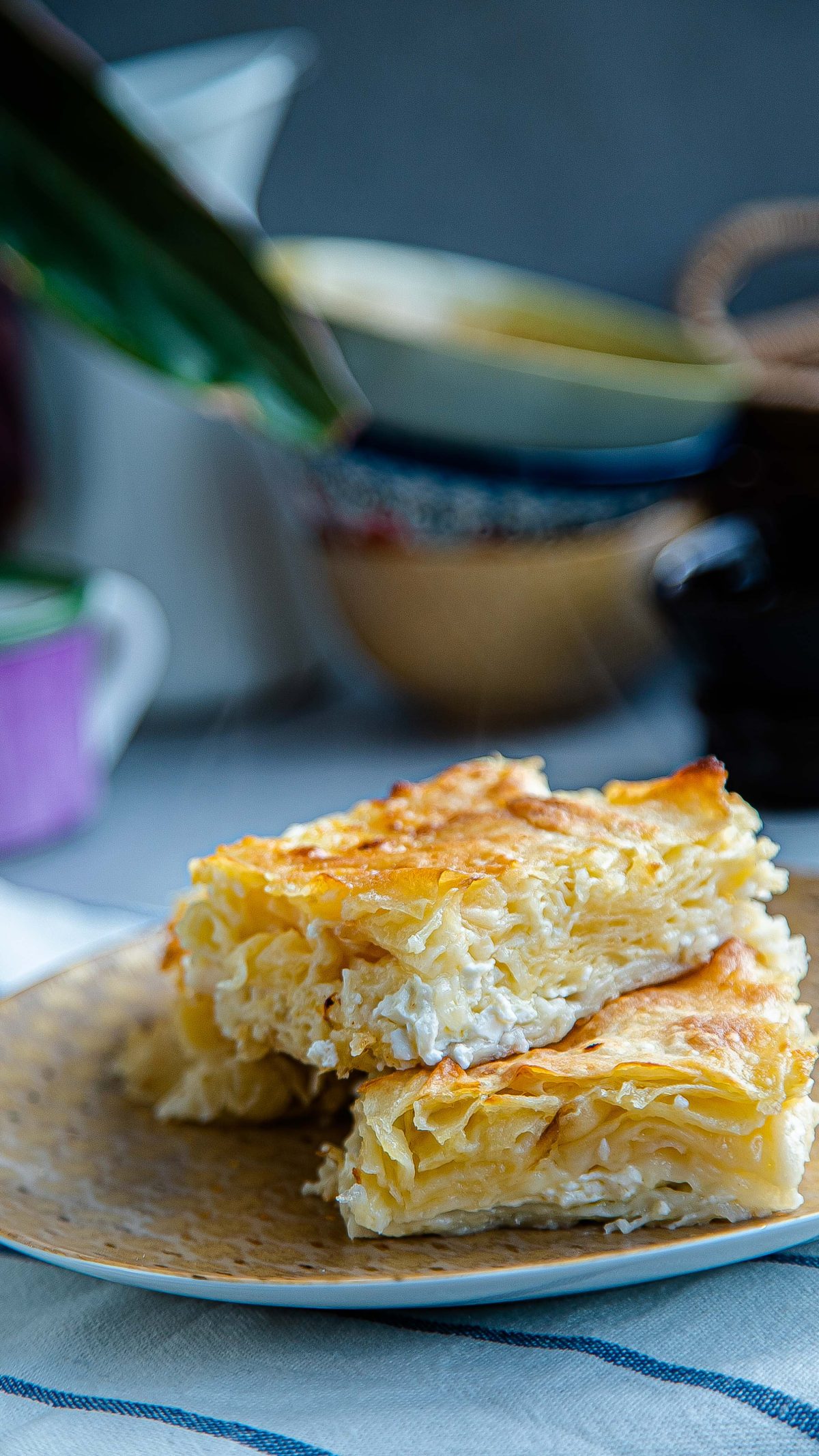 5. üçüncü yufkanın kalan yarısını peynirli için üzerine kırışık olarak serin. son yufkanın kenar kısımlarını genişçe koparıp orta kısmını bütün olarak bırakın.